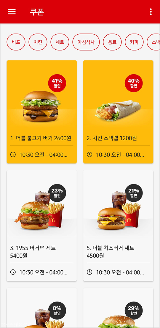 맥도날드 앱 쿠폰 역시 처음으로 이용했습니다.. 경쟁업체 앱처럼 배달주문 미리주문 등의 스마트한 기능은 없고.. 쿠폰이랑 메뉴소개, 매장찾기 정도만 있다는.. 맥딜리버리 앱이랑 왜 통합을 안하고 고집을 부리나 모르겠어요.. 암튼 앱쿠폰은 매주 바뀌는거 같더군요.. 단골을 위한 이런 배려는 좋네요.. 제가 이번에 이용한 쿠폰은 1955버거세트 쿠폰.. 바코드를 키오스크에 찍으면 쿠폰가에 주문가능..