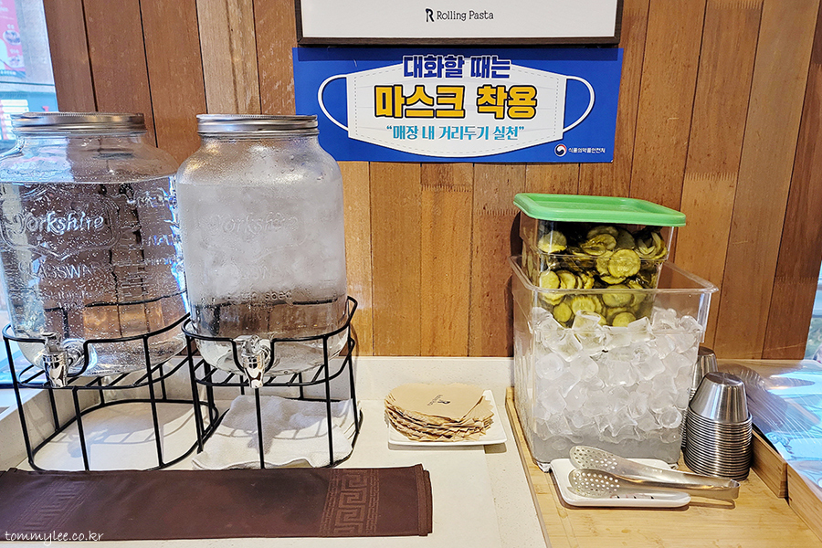 셀프바에서 물이랑 피클, 스푼, 포크, 냅킨 등을 알아서 가져가 셀프세팅 하는 방식.. 그렇다고 셀프 서비스는 아니에요.. 서버가 주문, 서빙, 버싱을 해줍니다..