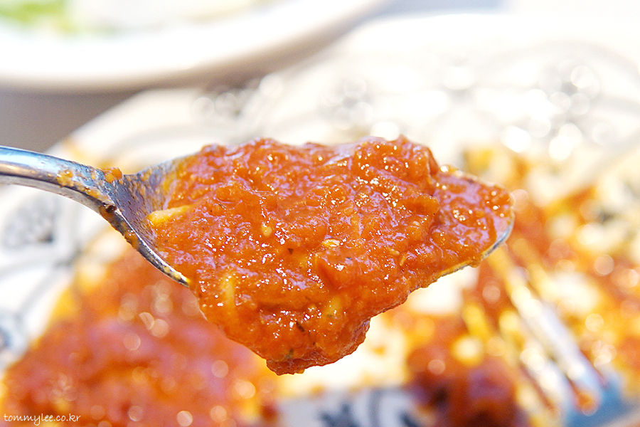 포크로 돌돌 감아 보면 이런 느낌.. 소스가 묽은 편이라 면에 잘 감기진 않는 타입..