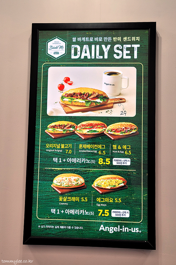 오늘의 메뉴는 반미 샌드위치 데일리세트.. 메뉴 및 가격을 살펴보면.. 오리지널불고기 훈제베이컨에그 햄&에그 8,500원, 꽃살크래미 에그마요 7,500원입니다.. 반미 샌드위치 주문하면 아메리카노를 2,000원에 준다고 보시면 됩니다.. 타 브랜드 샌드위치 세트보다 더 저렴한 것은 물론이고 시간제한 없이 하루종일 주문할 수 있습니다..