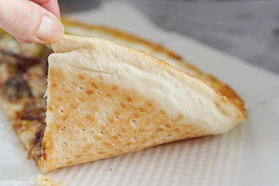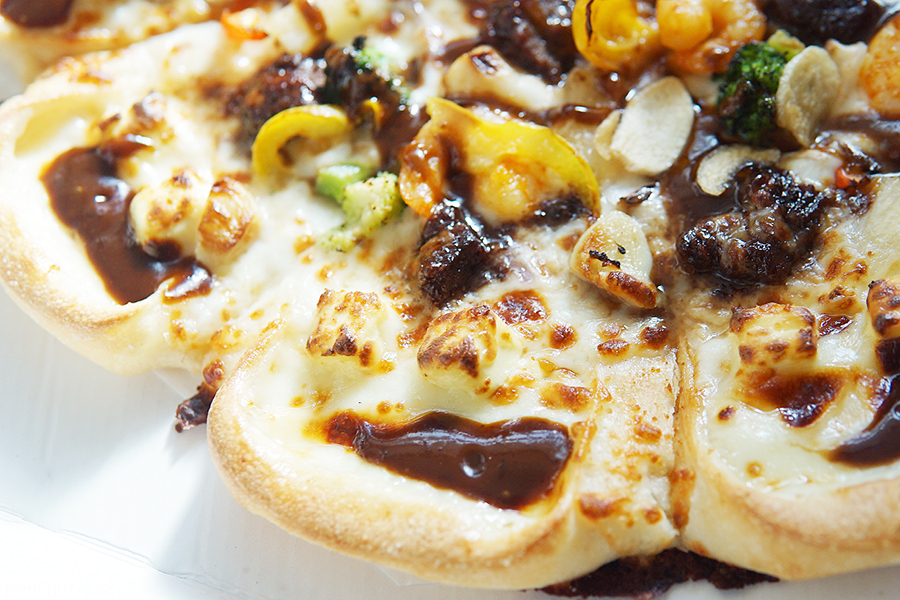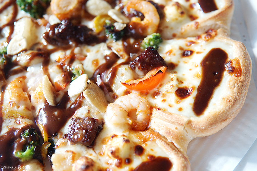 중심 토핑은 안심 스테이크, 통새우, 통마늘, 갈릭후레이크 정도가 되겠는데 그 이외에도 엄청나게 많은 토핑이 들어갑니다.. 파인애플까지 들어갈 줄은 상상도 못 했는데.. 이래도 만족을 못하겠니 하고 넣을 수 있는 건 다 넣은 느낌입니다.. 엣지에는 바베큐소스, 스테이크에는 블랙알리오 소스, 쉬림프에는 케이준마요 소스가 들어가서 콤보스런 맛이 납니다..
