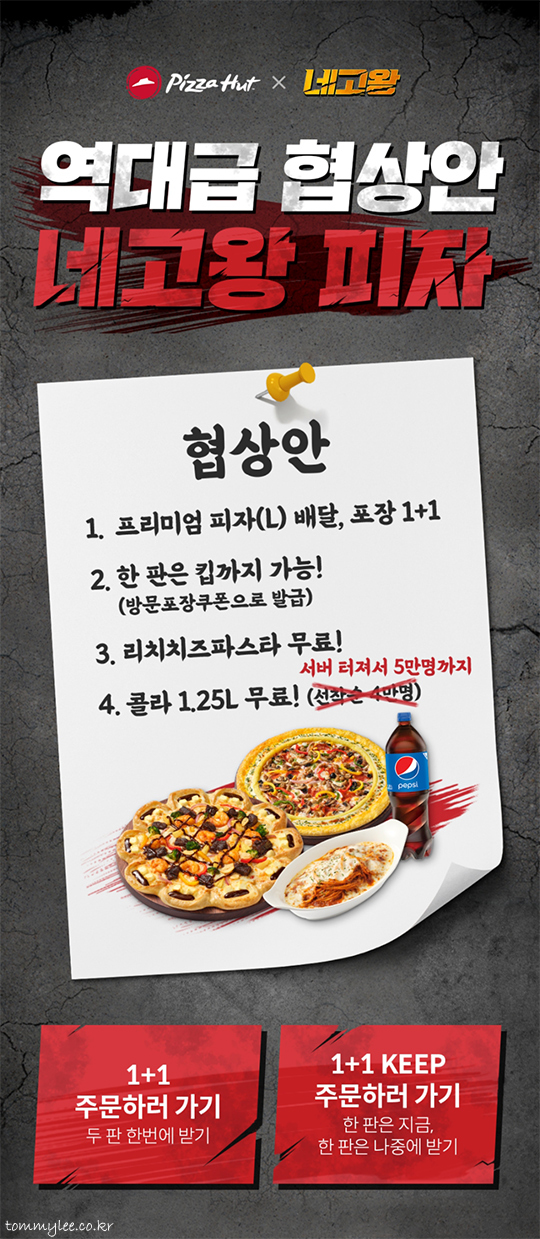 역대급 협상안 네고왕 피자.. 이번 협상안은 위와 같습니다.. 프리미엄 피자 라지 사이즈 1+1, 두 번 먹을 수 있게 키핑 가능, 리치치즈파스타 무료, 콜라 1.25L 무료.. 협상이 아니라 일방적으로 찍어 누르기였지만.. 뭐 피자헛도 서버가 다운될 정도로 확실한 트래픽을 얻었으니까요..