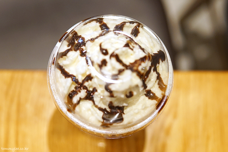휘핑크림 많이~를 외쳤으나 안 많이 주심.. ㅠ.ㅠ.. 그냥 아이스모카와 다를 게 없어 보이는 비주얼.. 카라멜 드리즐도 같이 뿌려 주는 게 좋을 듯한데..