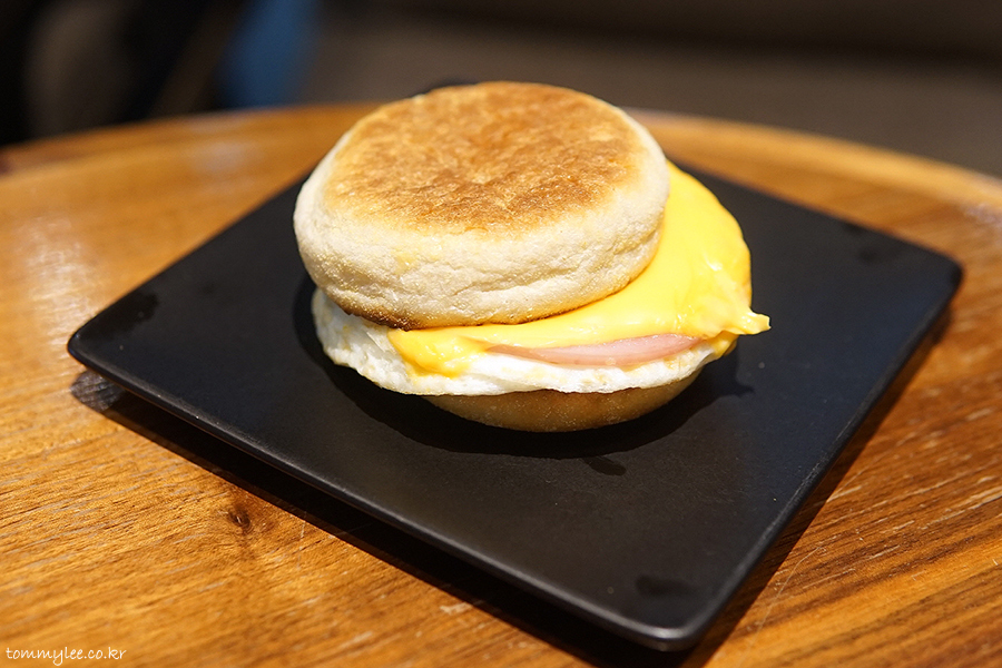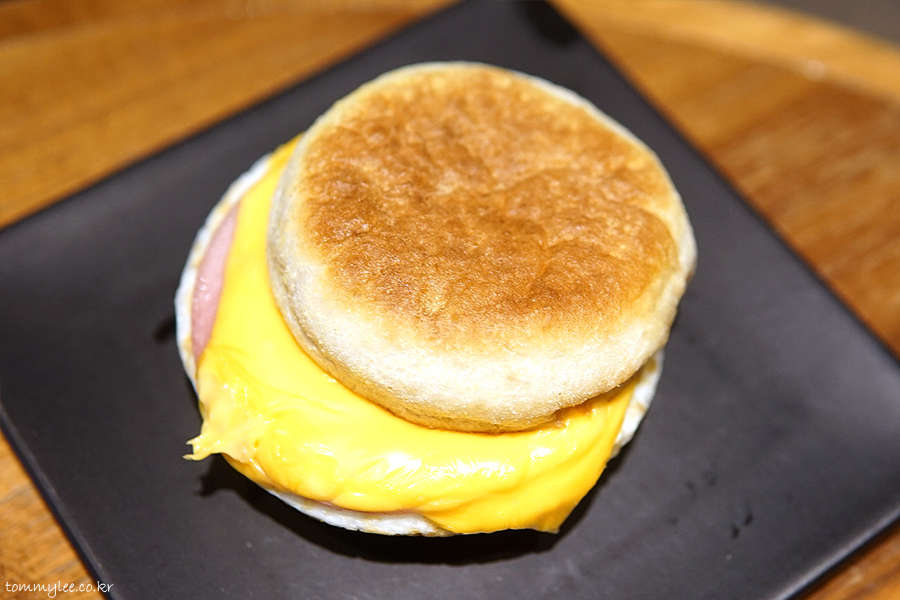 따뜻하게 데워주는 핫 샌드위치.. 따뜻하고 바삭한 컨디션의 잉글리쉬 머핀을 늘 즐기실 수 있습니다.. 오늘 바텀 쪽은 오버힛으로 딱딱하게 굳어 칼로 잘리질 않아서 커팅실패.. 샌드위치 단면을 못 보여 드리는 게 살짝 아쉽네요..