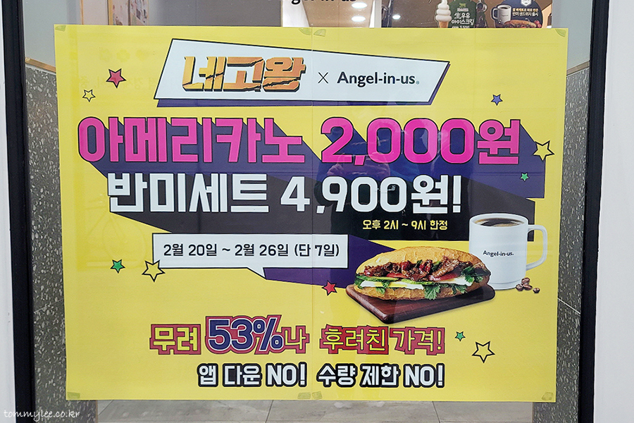 이렇게 연락이 오는 걸 보면 네고왕을 챙겨 보는 지인분들이 많은 듯.. 이번 카페편 협상 결과는 카페아메리카노 2,000원 반미샌드위치세트 4,900원.. 계산을 해보면 아메리카노는 54%할인이고 반미세트는 46%할인에 해당.. 전 라떼파라 아메리카노를 자발적으로 주문할 일은 사실상 없으나.. 반미세트 4,900원 이건 진짜 대박이라고 생각해서 결국 엔제리너스를 찾게 되었답니다.. 네고왕 카페네고 편을 못 보셨다면 위의 유튜브 영상을 클릭해보시라는..