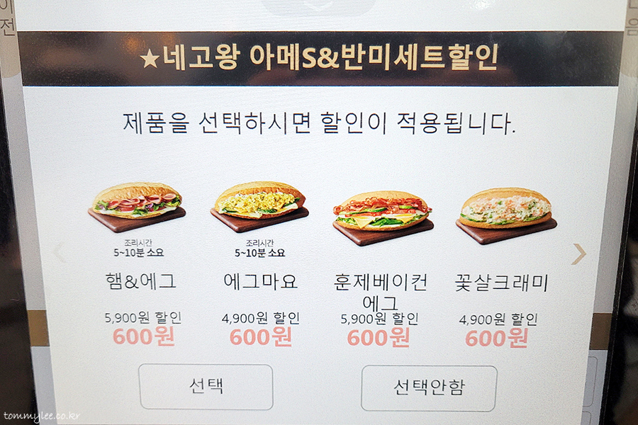 네고왕 협상이 반미샌드위치 600원이었군요.. 엔제리너스 반미 샌드위치 가격이 4,900원~7,000원인데.. 이게 600원이 되는거니까 최대 91%할인에 해당됩니다.. 네고왕 대단합니다.. 600원이라니.. ㅡㅡb.. 샌드위치 메뉴는 햄&에그, 에그마요, 훈제베이컨에그, 꽃살크래미, 오리지널불고기 5종 중 택일인데 균일가 600원..