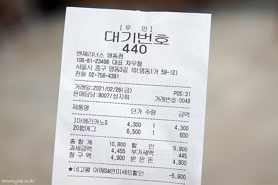 엔제리너스 영수증 인증샷.. 네고왕 아메&반미세트 5,900원 할인으로 4,900원 결제한 모습.. 햄에그 600원 진짜 웃겨.. 이거 실화입니다.. ㅋㅋㅋ..