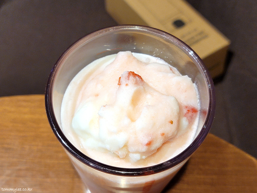 원래 딸기밀크보틀에 딸기주스를 담아 파는 컨셉이라 기본적으론 딸기주스가 나오는데.. 추가금을 내면 다른 딸기 음료로 바꿀 수 있답니다.. 그래서 크러쉬로 업차지..
