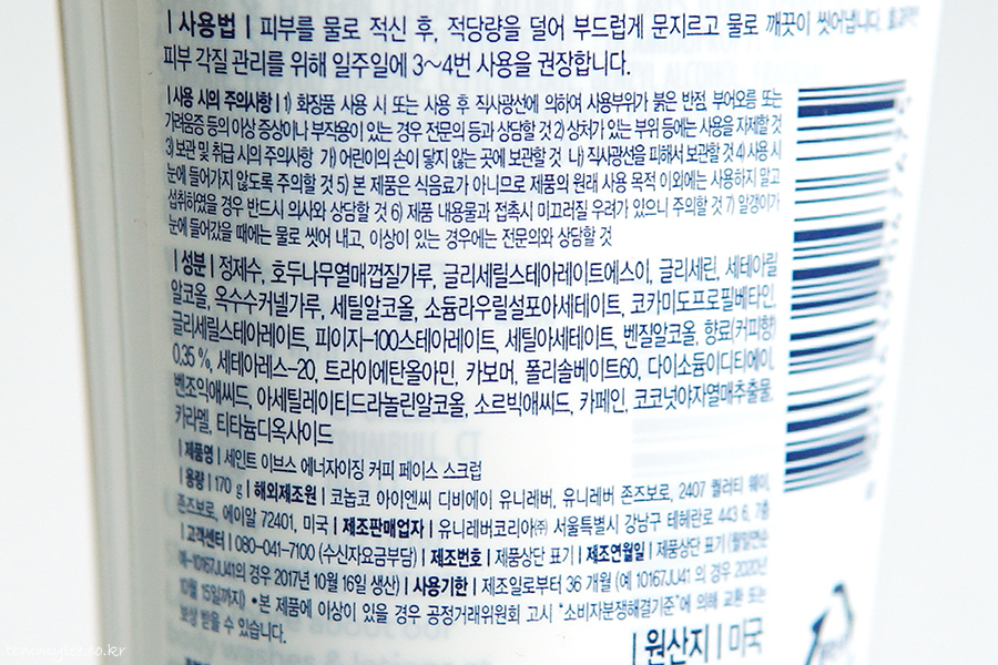 사용방법 : 피부를 물로 적신 후 적당량을 덜어 부드럽게 문지르고 물로 씻어 냅니다.. 페이스 스크럽이지만 바디에 사용해도 무방.. 일주일 3~4번 사용 권장이네요..