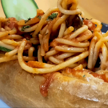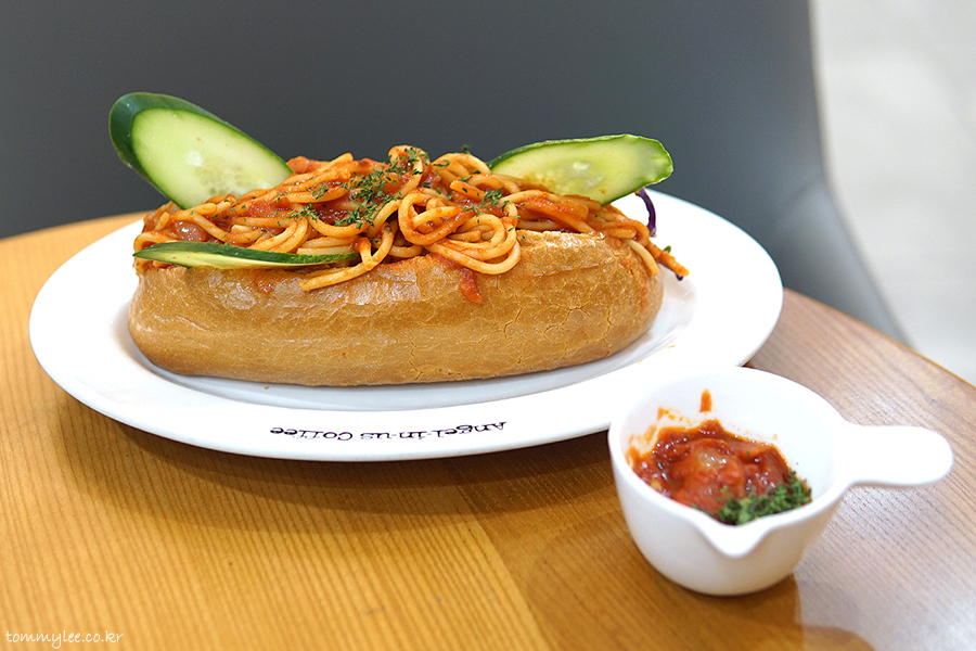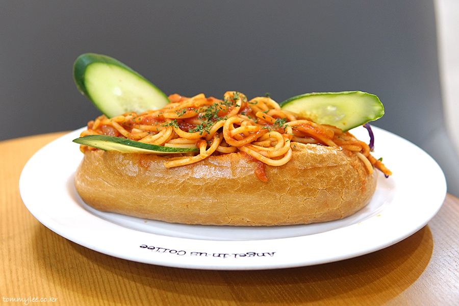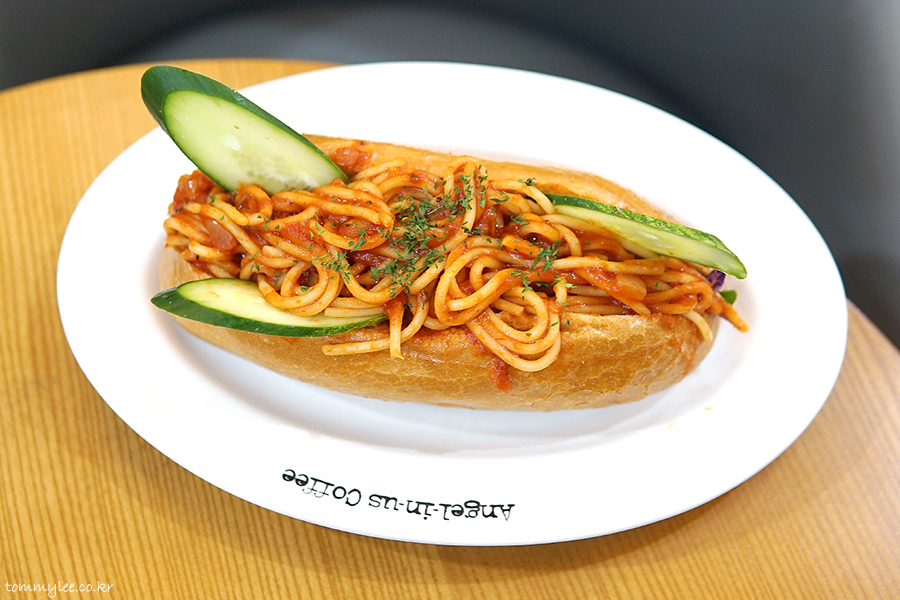 바삭하게 구워낸 쌀바게뜨 사이에 아라비아따 스파게티와 샐러드믹스, 마요네즈 그리고 오이슬라이스..