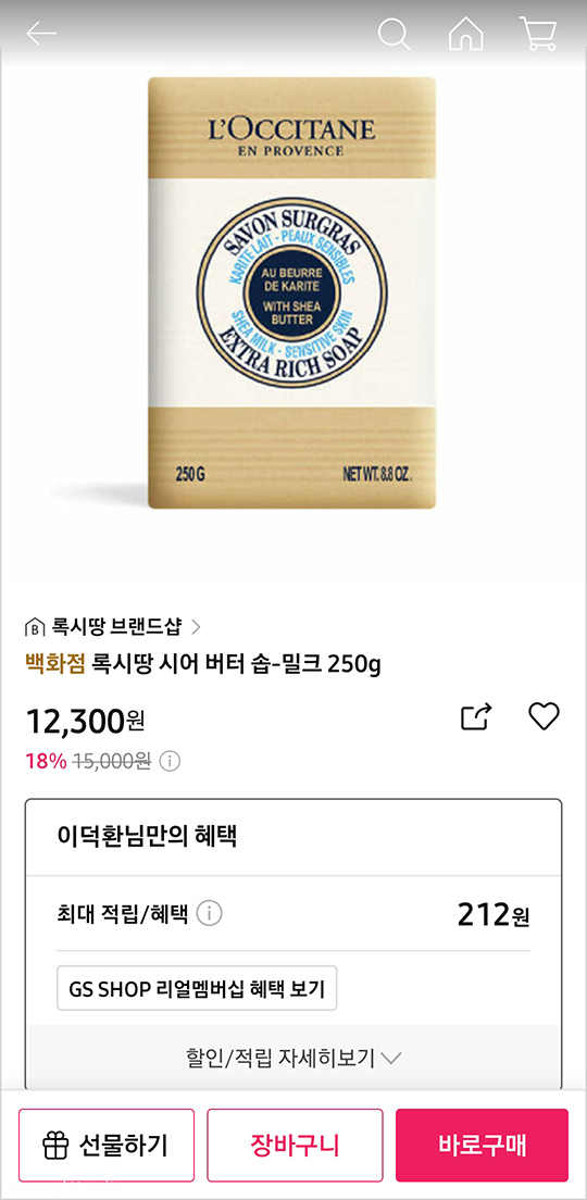 록시땅 비누는 100g 9,000원, 250g 15,000원으로 250g이 훨씬 저렴합니다.. 한번 써보면 무조건 250g으로 갈 수 밖에 없음.. 록시땅은 면세점 또는 백화점 추천.. 직구는 의미가 없어요 안 싸니까요.. GS샵 록시땅 시어 버터 솝-밀크 구입링크 → 요기로..