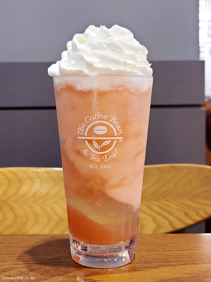 당연하게도 레귤러 단일 사이즈 음료.. 원래 과일계 블렌디드는 휘핑크림 올라가지 않는데 무료 엑스트라 혜택으로 휘핑크림 추가.. 커피빈은 휩많이요 하면 정말 많이 준다죠??..
