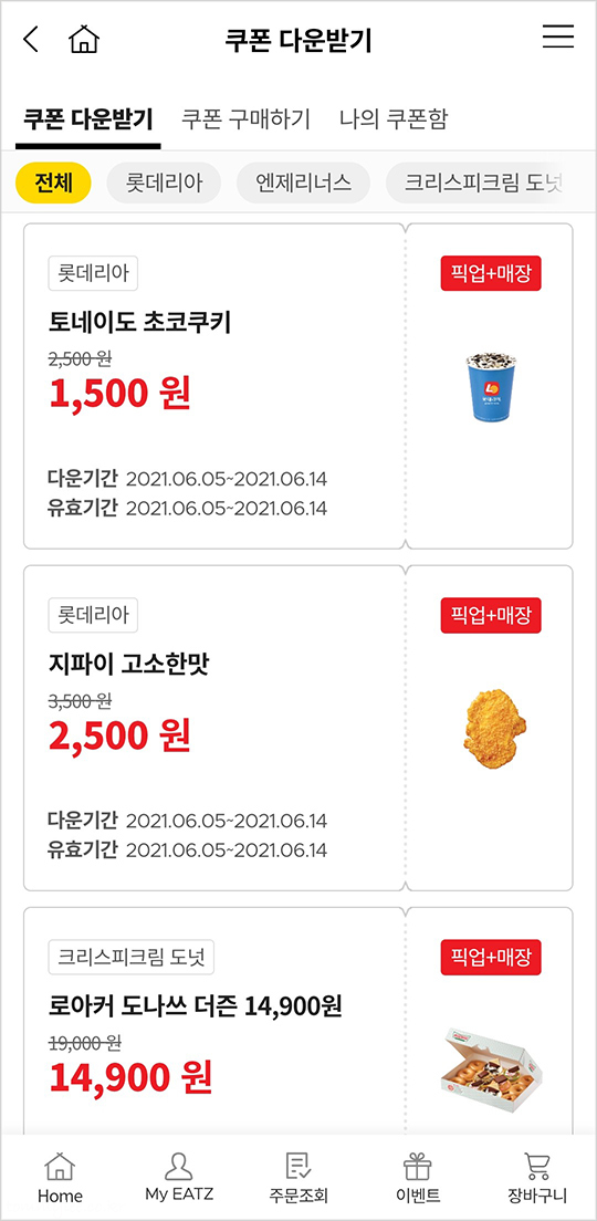 6월1차 다운로드 쿠폰으로는 디저트메뉴 2종 토네이도 초코쿠키, 지파이 고소한맛이 나왔는데.. 오늘은 오랜만에 지파이 먹기로..
