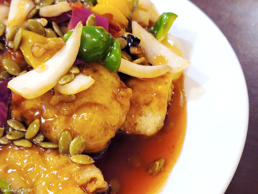 전엔 크리스피한 튀김옷에 산미가 진하고 라이트한 소스에 샹차이향도 강하고 했었지만.. 지금은 이런 모습으로.. 그래도 개성있긴 하지만요.. 호박씨가 많은게 인상적..