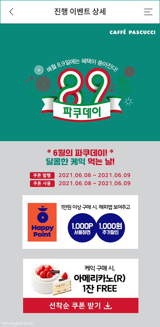 매월 8,9일에는 혜택이 쏟아진다~.. 파스쿠찌 89데이.. 6월 쿠폰은 케익 구매 시 아메리카노 1잔 FREE.. 뭐 예상대로의 내용이네요.. 6월에도 서프라이즈는 없었음.. ㅡㅡ;;..