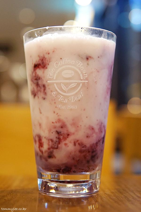 커피빈 코리아(!) 20주년 기념메뉴다 보니 커피빈에서는 한국적인 맛을 꼭 넣고 싶어 했던 듯합니다.. 그래서 메인인 블루베리 외에 복분자와 오디가 들어가 있는데요.. 블루베리 향이 너무 강하다 보니 둘이 묻히는 듯해서 아쉽네요.. 배분에 더 신경 썼어야 마땅했는데.. 아쉽습니다.. 마시다 보니 뽕나무에 주렁주렁 달린 오디를 따먹다가 입이 새까매졌던 추억도 떠오르고 하네요.. 오디 염색이 어찌나 안 씻기던지.. ㅡㅡ''..