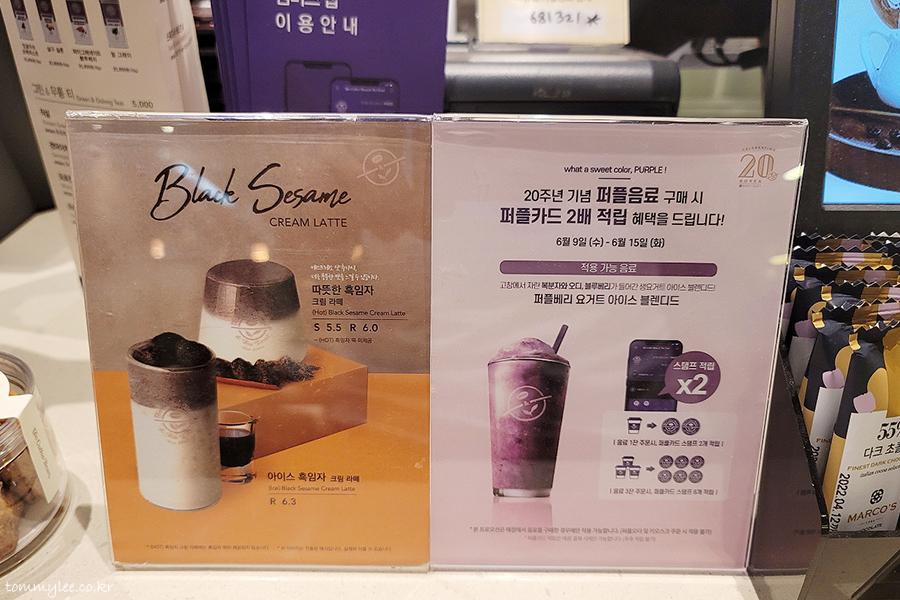 커피빈코리아가 벌써(?) 20주년을 맞이했다고 합니다.. 커피빈이 스타벅스보다 1년 늦게 들어왔죠.. 암튼 20주년 기념 음료인 퍼플베리.. 조금 더 보라보라 했더라면 좋았을 텐데.. 보라스러움이 다소 미약.. 더 화려하게 했어야 마땅했는데 아쉽..