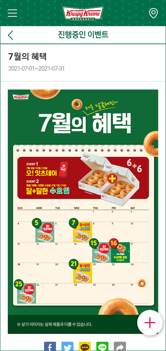 7월부터는 롯데잇츠 행사가 대대적으로 개편.. 매주 수요일 1+1 행사를 하는 게 아니라 1,3주 수요일에 하는 것으로 변경이 되었고요.. 롯데잇츠앱으로 오!잇츠데이인 5일, 15일, 25일에도 1+1 행사를 진행합니다.. 그리고 7월16일에는 84주년기념 행사로 더즌 8,400원 +하프더즌 840원 행사가 있다는.. 크리스피크림 또 가야 하려나.. ㅡㅡa..