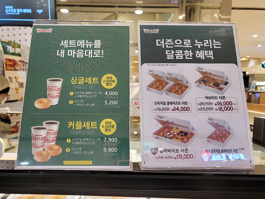 오리지널 글레이즈드 가격은 1,500원, 더즌 가격은 14,000원.. 미니 오리지널 글레이즈드 가격은 700원, 세트는 6,000원..