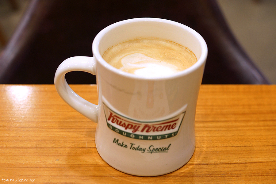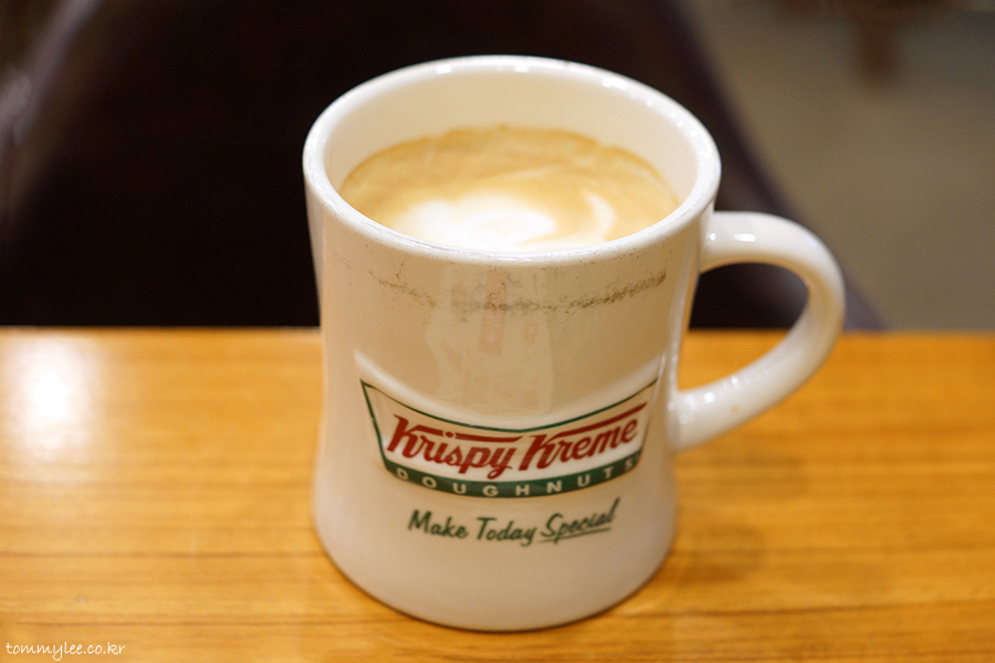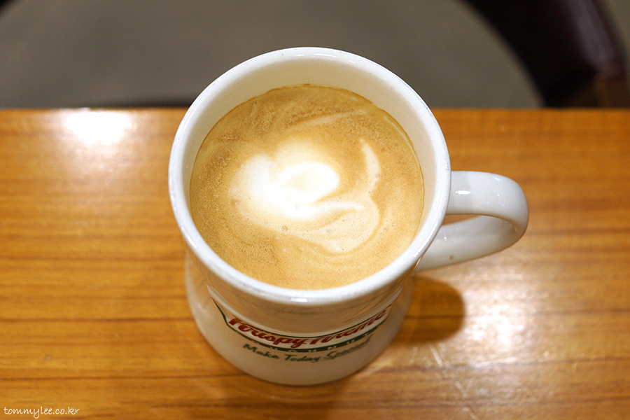 육중한 크리스피크림 오리지널 머그에 나온 카페라테.. 라떼아트를 해주려고 하신 거 같기도 하네요.. 하트 모양이 나올 뻔했는데 살짝 아쉽.. ㅋㅋㅋ..