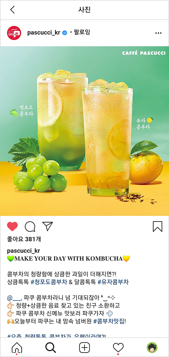 파스쿠찌 인스타그램 캡쳐해서 올려 봅니다.. 저 청포도 있는 이미지 사진이랑 너무 다르지 않나요??.. 식음료 통틀어 올해 먹고 마신 메뉴들 중 가장 이상과 현실의 갭이 큰 비주얼인 듯.. 상실감마저 느껴졌다면서.. ㅋㅋㅋ..