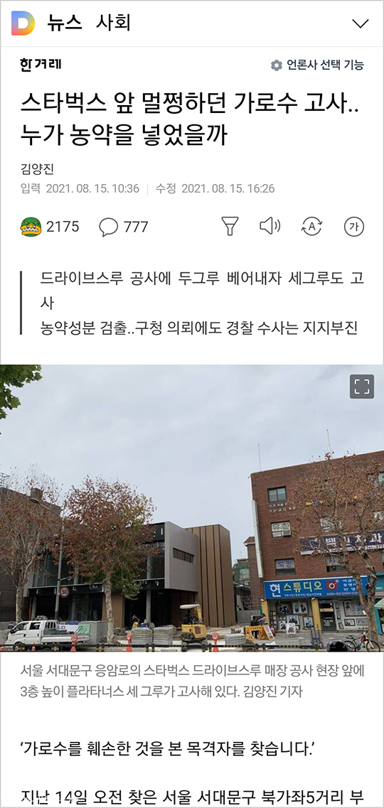 스타벅스 앞 멀쩡하던 가로수 고사, 누가 농약을 넣었을까 하는 타이틀의 기사인데.. 스타벅스 드라이브스루 매장 진출입로 공사를 위해 가로수 2그루를 베어 냈더니 멀쩡하던 매장 앞의 3그루가 누군가에 의해 고사(--)를 당해 매장 예정지에 있던 가로수가 5그루가 모두 없어지게 되었다는 스토리..