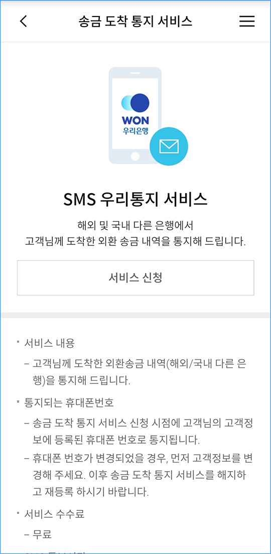 송금 도착 통지 서비스.. SMS 우리통지 서비스.. 해외 및 국내 다른 은행에서 고객님께 도착한 외환 송금 내역을 통지해 드립니다.. 서비스신청 버튼을 누르면.. 모든 준비는 완료~.. 이제 구글에서 입금만 해주면 되는.. ㅋㅋㅋ.. 이 SMS 서비스를 꼭 신청하셔야 하는 게 송금 받은 돈이 있는데 3일 이내에 본인이 확인을 안하면 은행원에게 전화가 와서 강제송금을 당한다고 합니다.. 이 경우 수수료가 당연히 붙게 되겠고요.. 그러니 알림 서비스는 꼭 필요한 것..