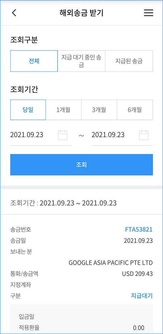 9월23일 9시에 송금내도(?) 송금인 GOO***E 어쩌고 문자가 오네요.. SMS 우리통지 서비스 굿굿.. 바로 우리WON뱅킹 앱실행..