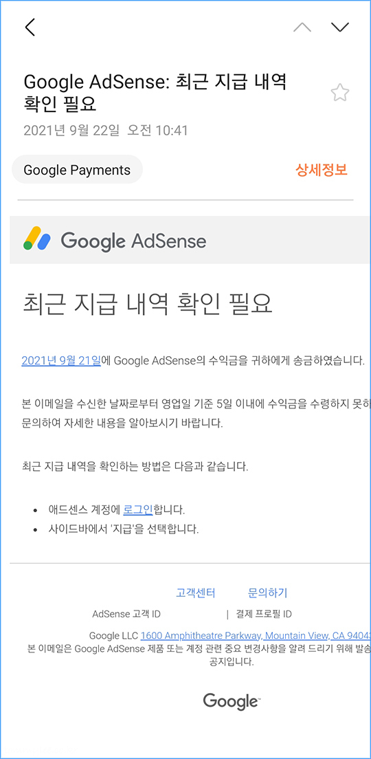 구글에서 이메일이 왔네요.. 구글 애드센스 최근 지급 내역 확인 필요라는 제목의 메일입니다.. 이메일 보낸 시점에서 구글에서는 돈을 보낸 겁니다.. 근데 추석연휴라서 은행은 쉬었네요.. 우흐흐..