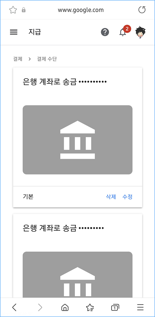 이렇게 결제수단 추가가 완료되었네요.. 구글 애드센스에서 계좌번호 입력 후에는 다시 우리은행으로 돌아와서 하셔야 할 게 있는데요..