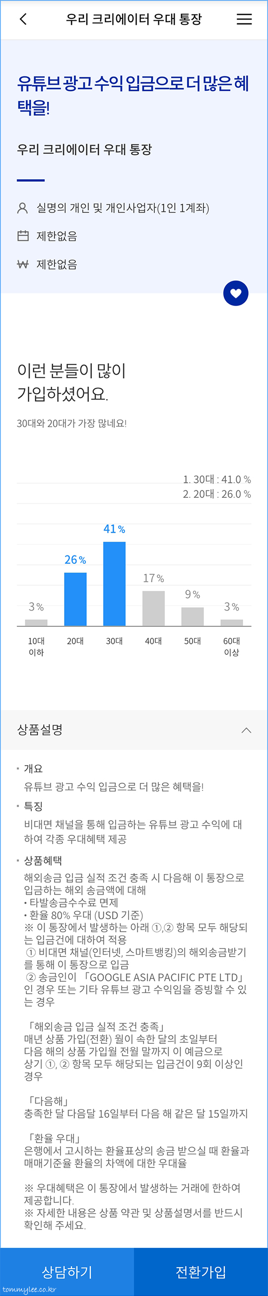 유튜브 광고수익 입금으로 더 많은 혜택을~ 우리 크리에이터 우대통장.. 비대면 채널을 통해 입금하는 유튜브 광고 수익에 대하여 각종 우대혜택 제공.. 혜택은 송금수수료 면제, 환율 80%우대.. 오호~ 들었던 그대로네요.. 1년동안은 누구나 해주고 1년 이후로는 실적조건을 충족해야 계속 혜택을 주는 것 같은데 입금 건수 9회 이상을 충족해야 한다는 내용입니다.. 저는 매달 송금받을 예정(?)이기 때문에 상관없을듯 하고.. USD 50,000 상당액 이하 조건, 동일송금인으로부터 일2회 초과 또는 월3회 초과 수취하는 경우, 영업점에서만 거래 가능하며 영업점에서 업무처리 시 타발송금수수료 정상 부과된다는 내용도 있는데 이것 역시 티스토리에는 해당사항이 없어 보입니다.. 5만달러 이상 받고 싶다.. ㅠ.ㅠ..
