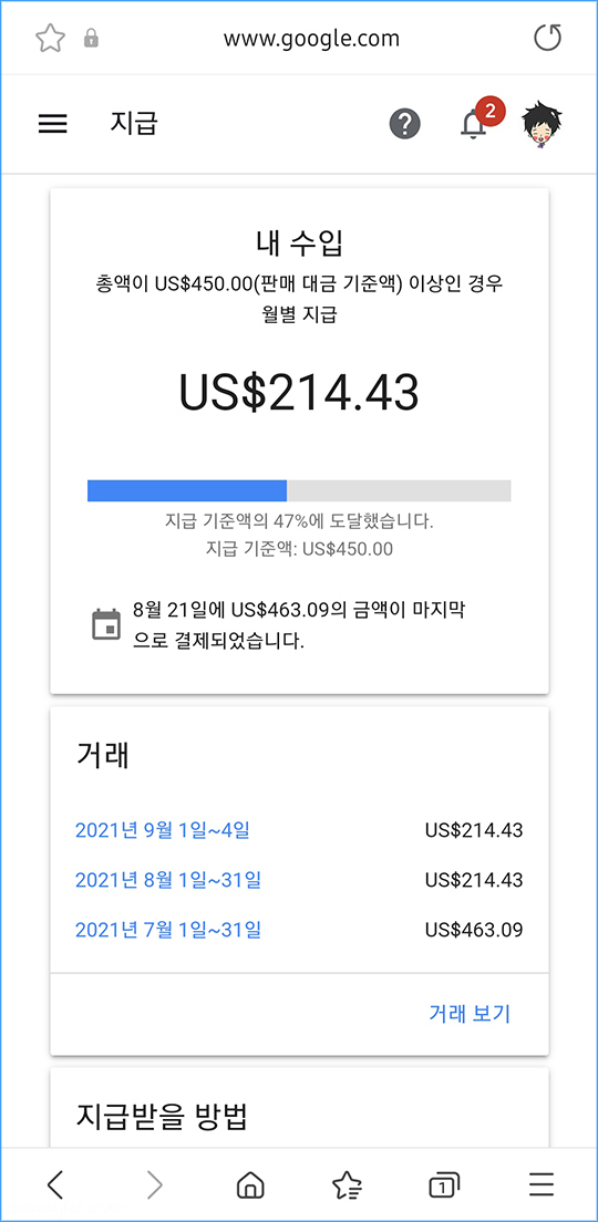 조회하면 GOOGLE ASIA PACIFIC PTE LTD에서 보낸 저의 돈이 지급대기가 걸려 있죠??.. 근데 8월 수익금이 $214.43인데 지급대기인 송금액은 $209.43이네요.. 내 5달라 어디로??.. 이 돈은 누가 먹는 건지.. ㅡㅡa.. 원래 이러는 건가요??.. 아시는 분 계시면 댓글 부탁합니다..