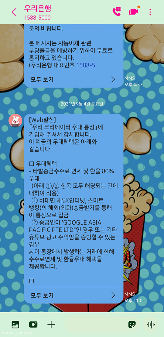 저는 제일은행의 배신 이후로 5천원 수수료 내면서 신한은행에서 송금을 받고 있었는데요.. 지인분께서 우리은행에서 구글저격(?) 통장이 나왔다면서 권해주셔서.. 우리은행의 우리크리에이터 우대통장을 만들게 되었답니다.. 해외송금 수수료 전액(!)면제, 80%환율우대까지 이건 새로 파야해~하는 생각이었던..