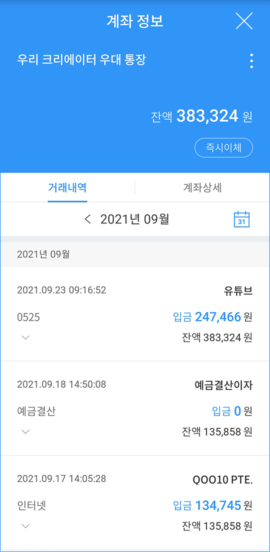 우리 크리에이터 우대 통장 화면으로 이동해서 입금이 잘 되었나 확인.. 유튜브(--)에서 입금 247,466.. 수수료 안붙는 거 맞습니다..