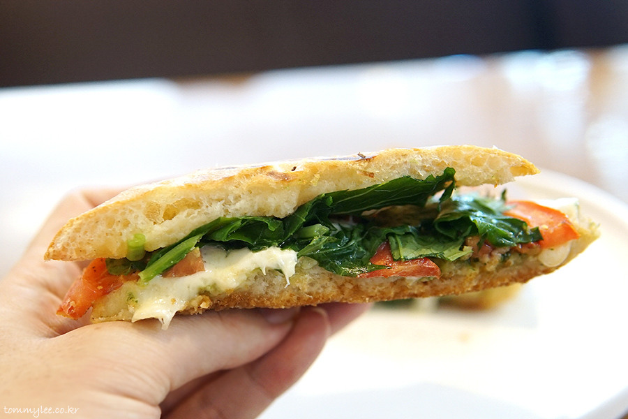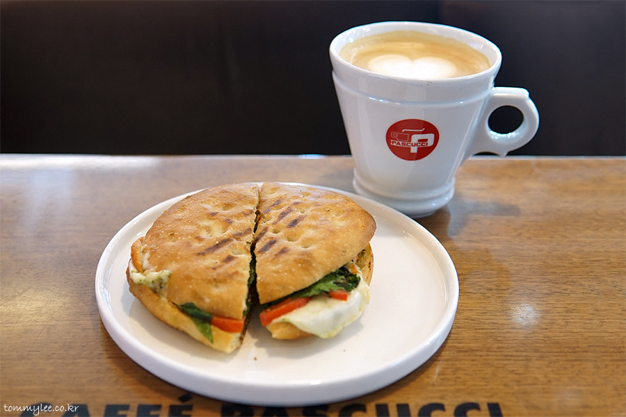 둥그런 포카치아 빵에 생모짜렐라와 토마토 그리고 루꼴라가 잔뜩.. 색이 플래그 조합이라 딱 파스쿠찌의 시그니처 샌드위치의 느낌..