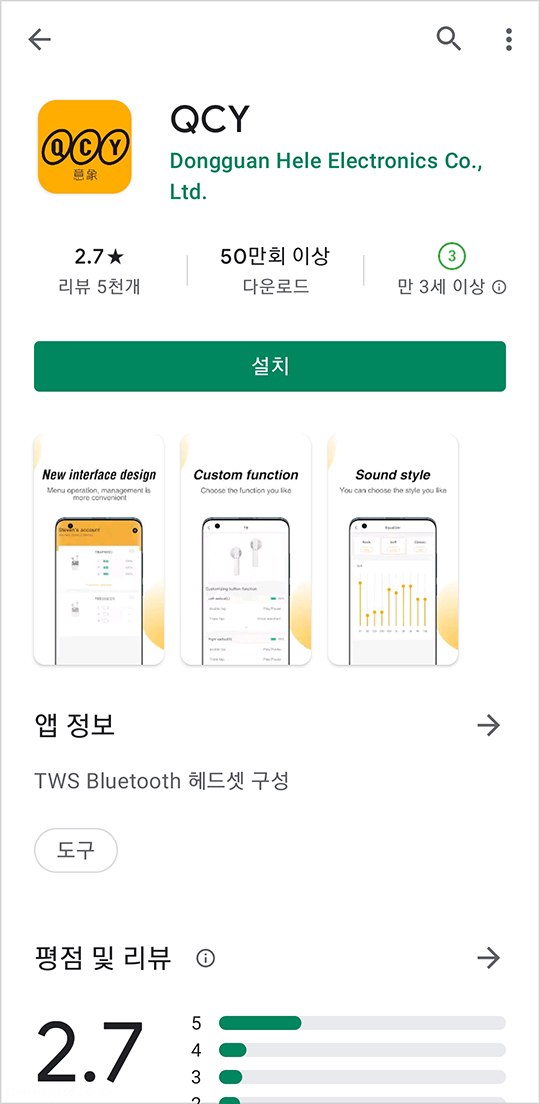 스토어에서 QCY로 검색하면 이렇게 QCY 앱이 나옵니다.. 바로 설치~..