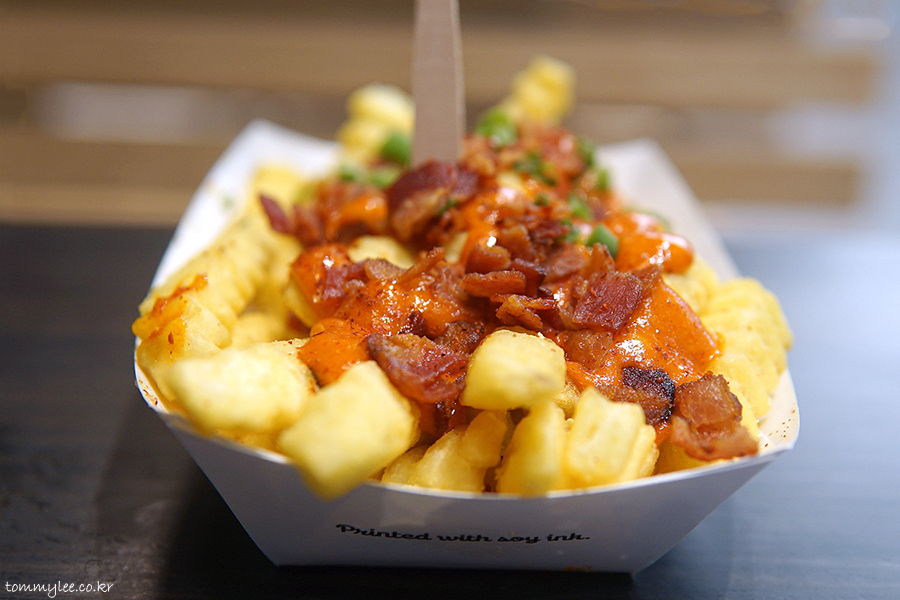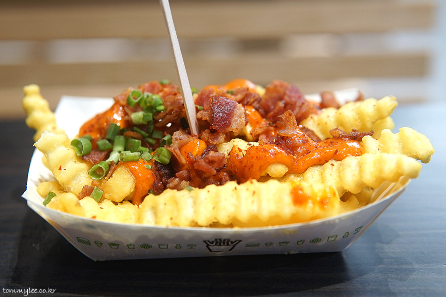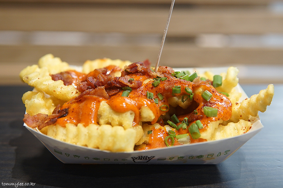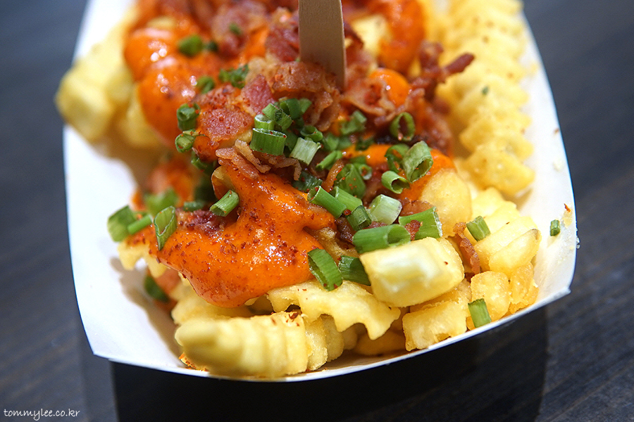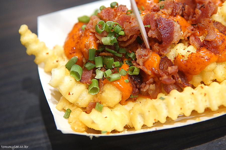 두툼한 크링클컷 프라이에 고추장 마요소스와 베이컨칩을 올리고 쪽파와 고춧가루로 장식한 그런 느낌이라 보시면 되겠네요..