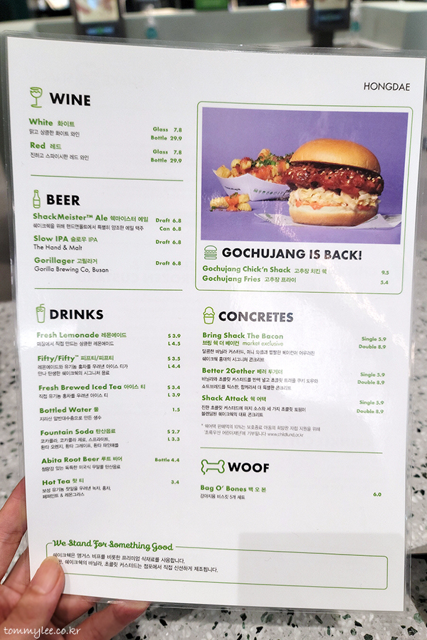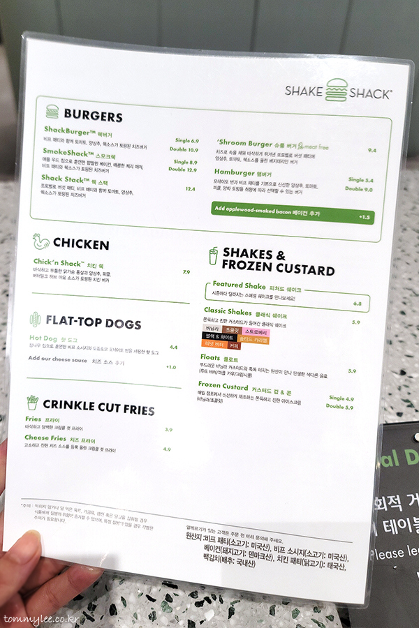 오픈한 지 한 달이 채 안된 매장인지라 쉑쉑 답지 않게 많이 친절한 홍대점.. 안내 직원분께서 친절하게 메뉴판을 보시겠냐며 건네주셨답니다.. 쉐이크쉑 메뉴 및 가격은 이 메뉴판을 보시면 될 듯합니다.. 메뉴가 의외로 몇 가지 없고 간단하다는.. 쉑쉑은 절대 어렵지 않습니다..
