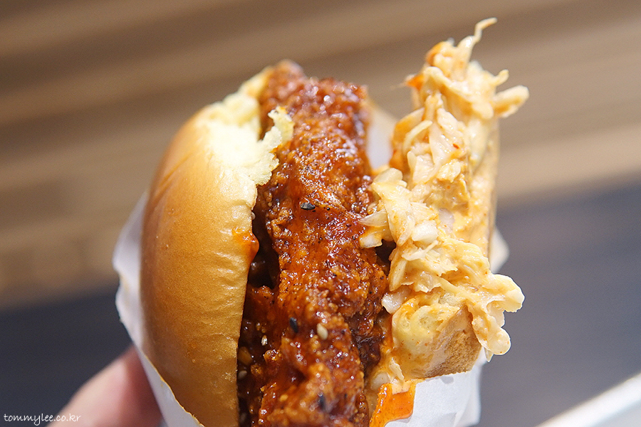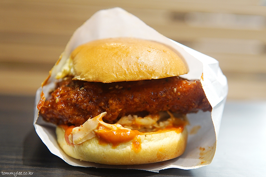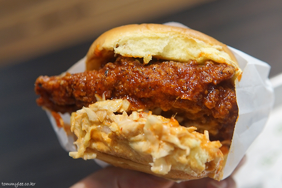 구성은 단순합니다.. 고추장 글레이즈의 치킨브레스트 패티에 백김치슬로를 곁들이고 고추장마요 살짝 이게 끝~.. 백김치슬로우 양이 생각보다 많아서 살짝 놀란.. 치킨 샌드위치엔 코울슬로라는 공식을 그대로 한국의 맛에 적용.. 어쨌거나 말 그대로의 K-치킨버거..
