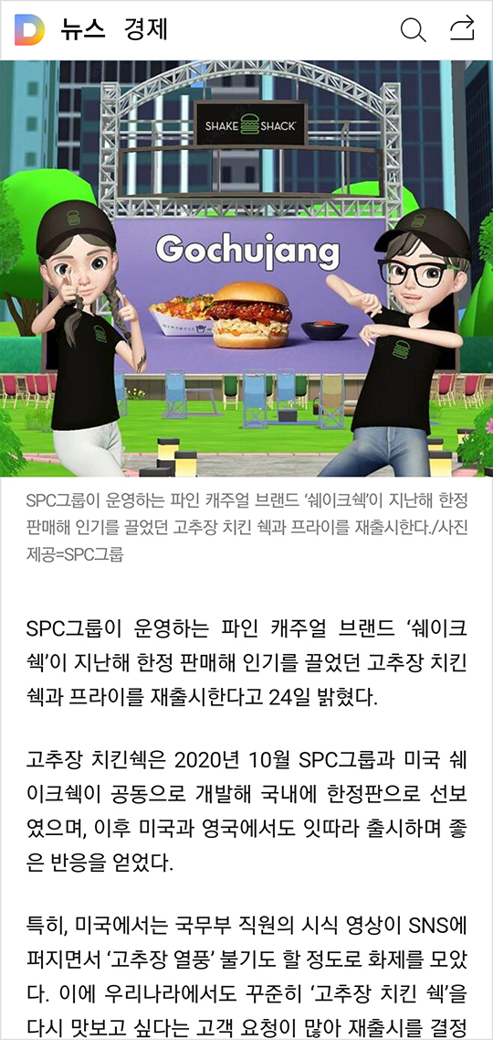 고추장 치킨쉑은 2020년 10월 SPC그룹과 미국 쉐이크쉑이 공동 개발해 국내에 한정판으로 선보였으며, 이후 미국과 영국에서도 잇따라 출시하며 좋은 반응을 얻었다는 보도자료가 배포되었는데.. 기사엔 고추장 치킨쉑을 다시 맛보고 싶다는 고객 요청이 쇄도했다고 써있네요.. 왠지 웃기다고 막.. ㅋㅋㅋ..