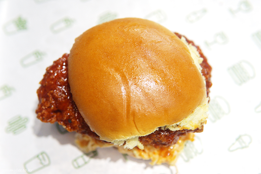 위에서 바라보면 이런 느낌.. 고추장 소스를 머금은 치킨 패티가 길쭉해서 밖으로 삐져나온 훈훈한 모습 확인할 수 있었네요.. 제가 고추장이라는 단어를 영화, 드라마에서 처음 접한 게 5년 전 영화 '아메리칸셰프'에서 였는데요.. 거기서 셰프가 직접 담근 고추장을 이용한 코리안 스타일 신메뉴를 선보이다가 보수적인 사장에게 그날 바로 짤리는 그런 내용이었는데.. 그때는 제가 쉐이크쉑에서 고추장소스 버거를 만나게 될 줄은 몰랐답니다.. 5년 만에 상황이 많이 달라졌음.. 코리안 스타일이라는 신문물이 드디어 먹히고 있는 분위기예요.. ㅡㅡ;;..