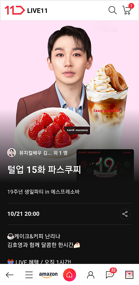 커피마시는데 딱 그 시간에 11번가에서 파스쿠찌 19주년 생일파티 라이브를 해서 방송을 봤답니다.. 요즘 라이브 쇼핑이 유행인데.. 뭐던 간에 방송하면 평소보다 무조건 싸게 팔긴 한답니다.. 비싸면 바로 채팅으로 안싸다고 난리날테니까.. ㅋㅋㅋ..