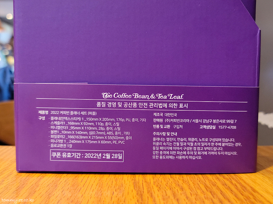 제품명 : 2022 커피빈 플래너 세트 퍼플, 구성 : 플래너, 스케줄러, 미니캘린더, 볼펜, 화일꽂이2, 미니가방, 음료교환권, 제조국 : 대한민국.. MADE IN KOREA 굿굿~..
