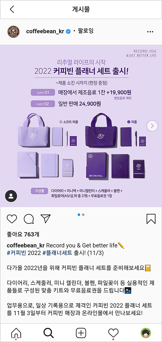 리추얼 라이프의 시작~ 2022 커피빈 플래너 세트는 퍼플과 소프트퍼플 2가지 종류가 있고.. 매장에서 제조음료 1잔 + 19,900원, 일반 판매는 24,900원이라는 내용의 커피빈 인스타그램 포스팅..