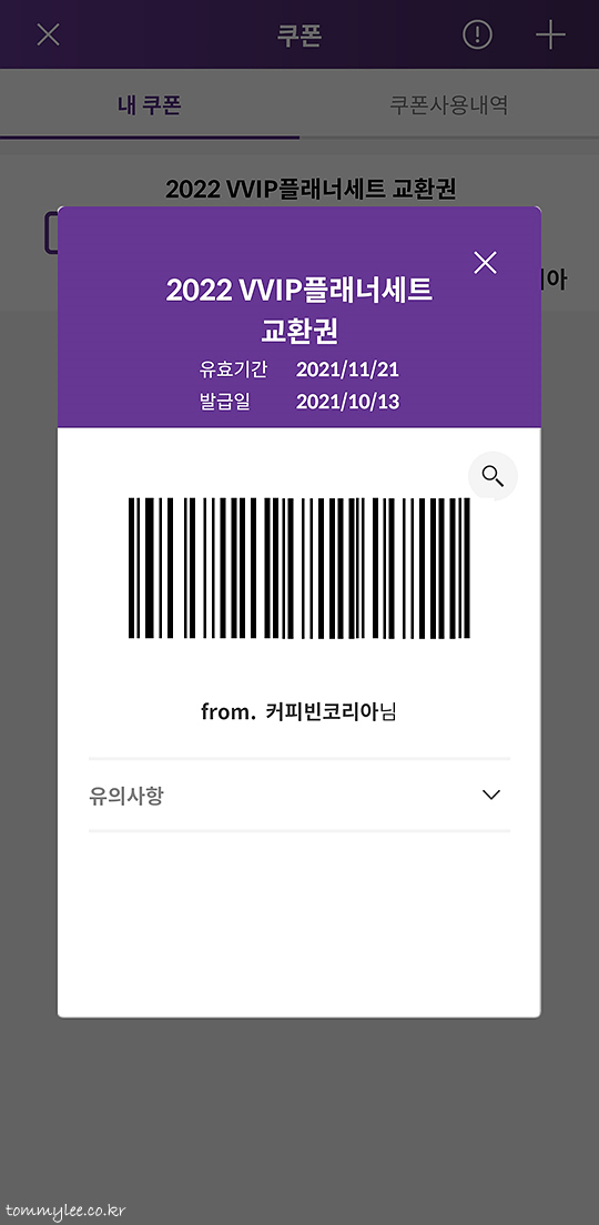 이 쿠폰을 그냥 제시하면 끝.. 올해 커피빈 VVIP 특권은 이걸로 끝~..