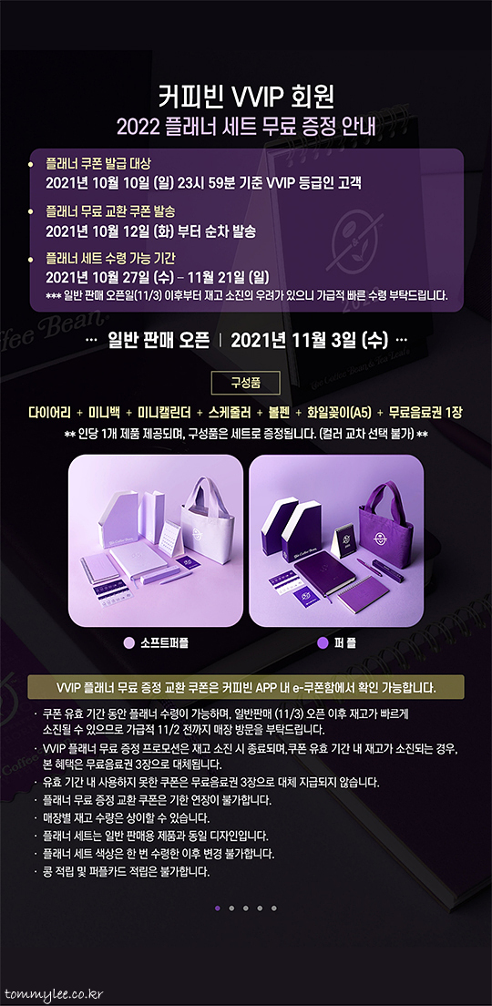 커피빈 2022 플래너 세트는 발매 전에 VVIP 회원 대상으로 미리 무료교환 쿠폰이 발송되었고 플래너 수령도 일반 판매 오픈 일주일 전부터 가능했답니다..