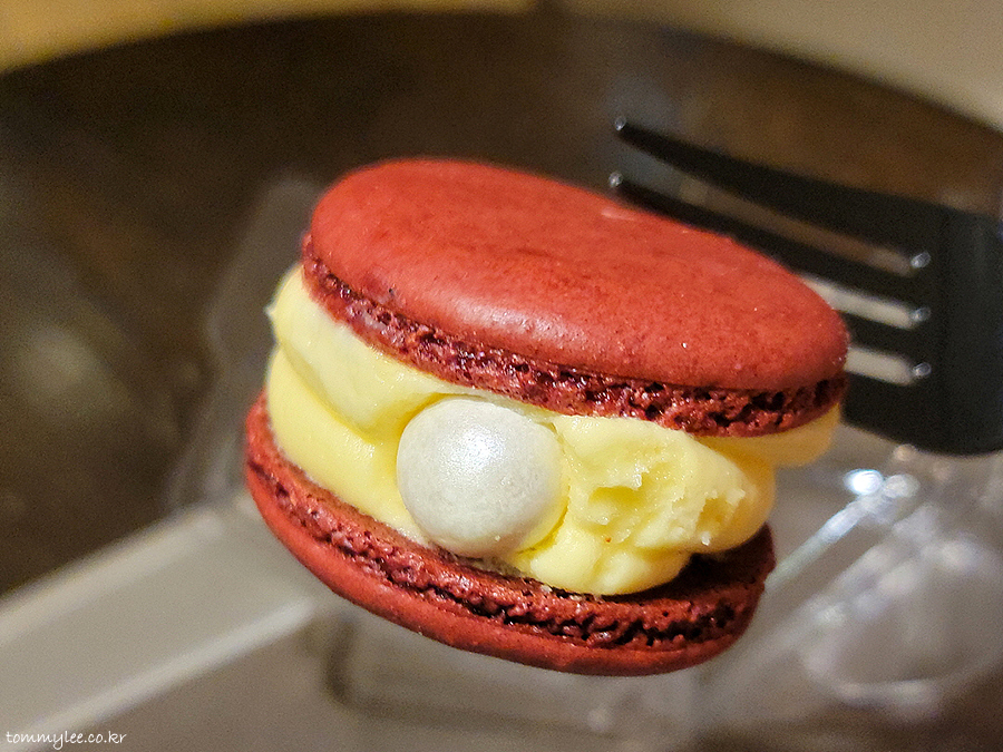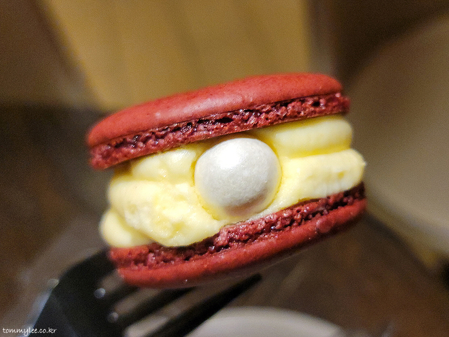 레드벨벳 뚱카롱 커팅해보면 이런 느낌.. 오호 마카롱 중앙에 레드벨벳 케이크 큐브가 들어가 있네요.. 필링은 크림치즈버터 필링입니다.. 부드럽고 치즈맛도 강하고 나쁘지 않은 듯..