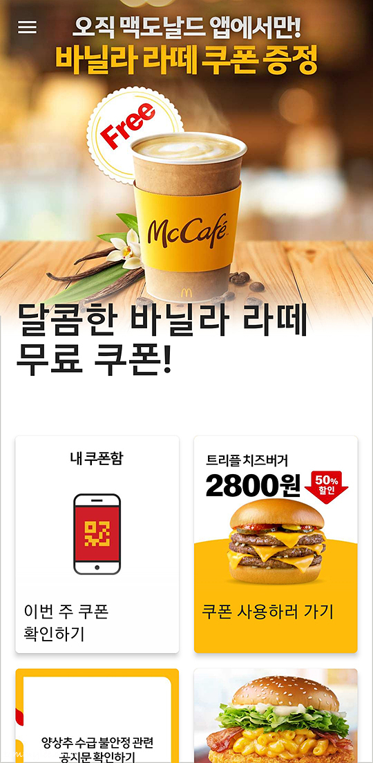 오직 맥도날드 앱에서만, 바닐라라떼 쿠폰 증정.. 달콤한 바닐라라떼 무료쿠폰 룰루~..