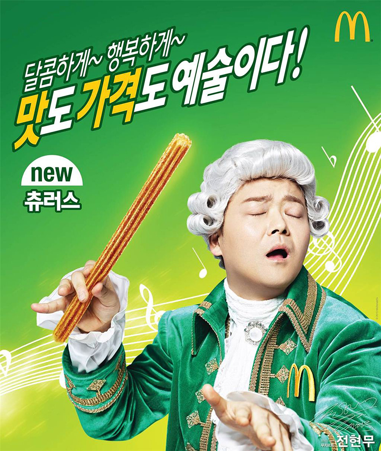 맥도날드 츄러스하면 전 이 광고가 생각나요.. 맛도 가격도 예술이다 무차르트 전현무 버전 맥츄러스 포스터.. 이때가 맥도널드 광고 전성기였는데.. 지금은.. ㅠ.ㅠ..