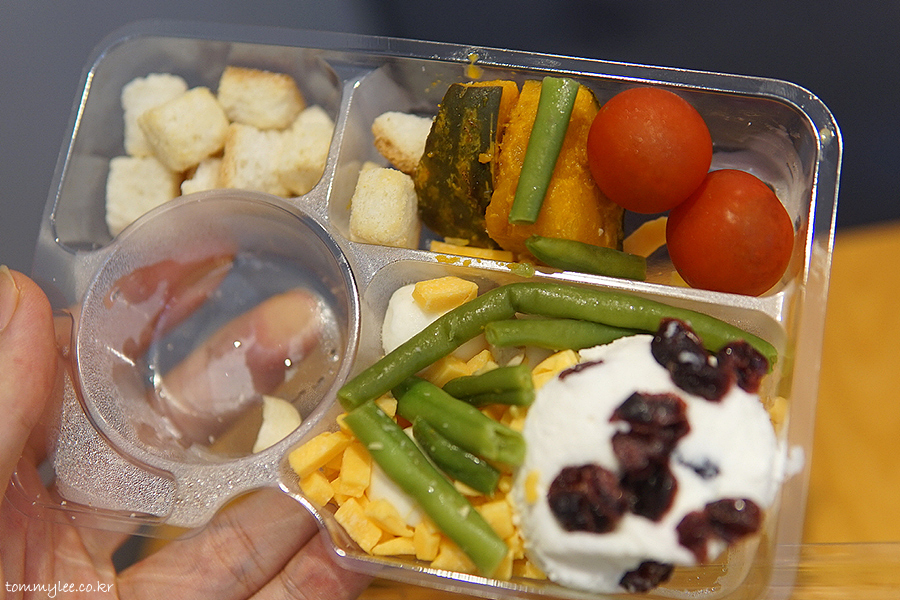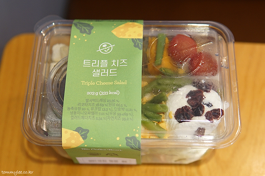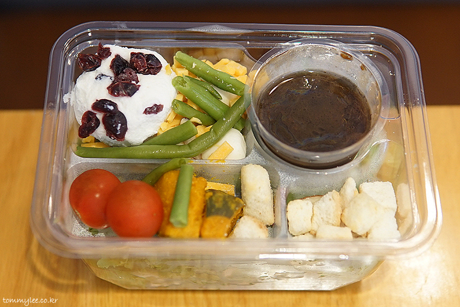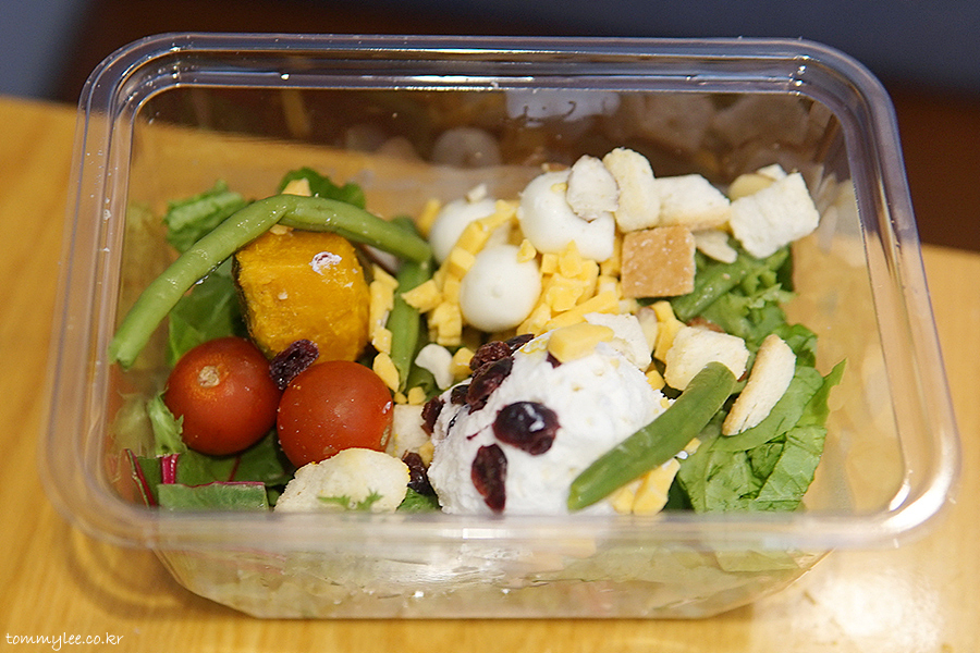 트리플 치즈와 함께 그린빈, 아몬드, 크랜베리, 방울토마토, 단호박, 크루통이 들어가는 듯.. 구성은 나쁘지 않은 듯싶네요..